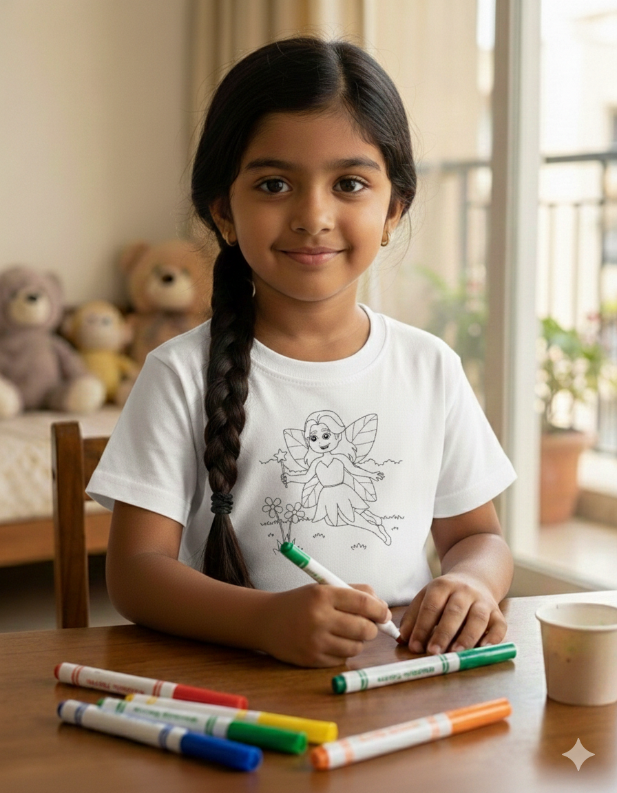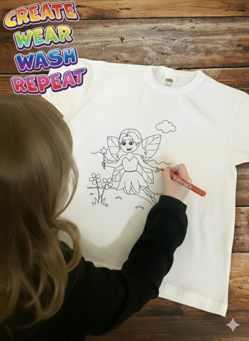 The little ruler of the house will love colouring our Fairy design kidoraa t-shirt.
